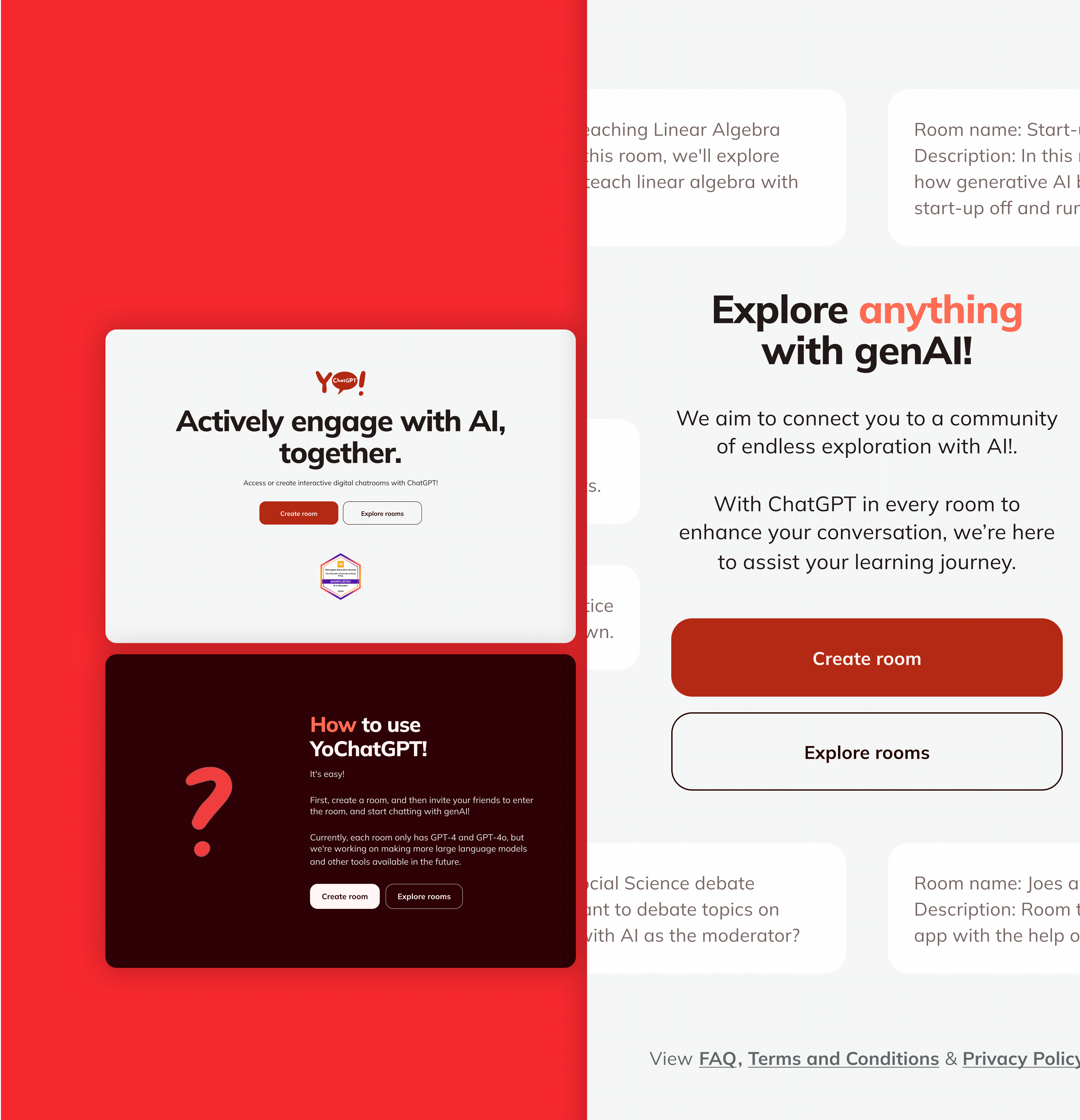 YoChatGPT! aims to provide a space for students, educators, and AI to unite, fostering a shared knowledge and creativity community. In a world where individual interactions with AI can feel isolating, our solution integrates generative AI into a collective chatroom, enhancing the educational experience and promoting teamwork among learners.
